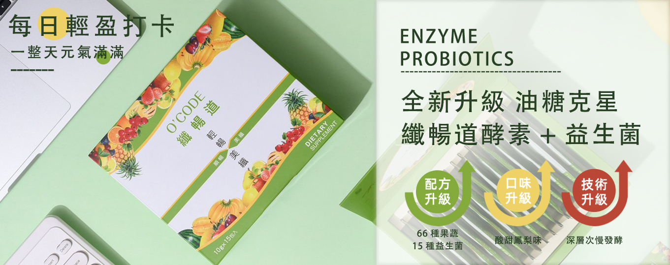 麥芽糊精、乳糖醇(甜味劑)、羊角豆萃取物、菠菜粉、荷葉粉、大麥苗粉、綜合蔬果酵素粉(鳳梨、番茄、青木瓜、葡萄、梅子、番石榴、檸檬、葡萄柚、甜橙、椪柑、龍眼、桃子、胡瓜、南瓜、絲瓜、冬瓜、苦瓜、紅蘿蔔、地瓜葉、小黃瓜、大白菜、小白菜、高麗菜、蓮霧、桑葚、青椒、落葵、芹菜、西洋芹、青江菜、本島萵苣、芥藍、巴西利、紅棗、荔枝、紅龍果、金桔、蘋果、百香果、青花椰菜、馬鈴薯、薑、地瓜、櫛瓜、山藥、香菇、柚子、蕹菜、秋葵、李子、棗子、哈密瓜、菠菜、甜椒、茄子、茭白筍、菜豆、敏豆、紅鳳菜、柳丁、牛蒡、莧菜、萵苣、扁蒲、金針菇、黑木耳)、難消化性麥芽糊精、草決明、十五種益生菌(Bacillus coagulans凝乳芽孢桿菌、Bifidobacterium bifidum兩歧雙歧桿菌、Bifidobacterium breve短雙歧桿菌、Bifidobacterium animali subsp.lactis乳雙歧桿菌、Bifidobacterium longum長雙歧桿菌、Lactobacillus acidophilus嗜酸乳桿菌、Lactobacillus casei乾酪乳桿菌、Lactobacillus delbrueckii subsp. Lactis德氏乳桿菌乳酸亞種、Lactobacillus fermentium醱酵乳桿菌、Lactobacillus helveticus瑞士乳桿菌、Lactobacillus paracasei副乾酪乳桿菌、Lactobacillus plantarum植物乳桿菌、Lactobacillus reuteri羅伊氏乳桿菌、 Lactobacillus rhamnosus鼠李糖乳酸桿菌、Streptococcus thermophilus嗜熱鏈球菌)、檸檬酸、鳳梨香料、蔗糖素(甜味劑)、二氧化矽。
