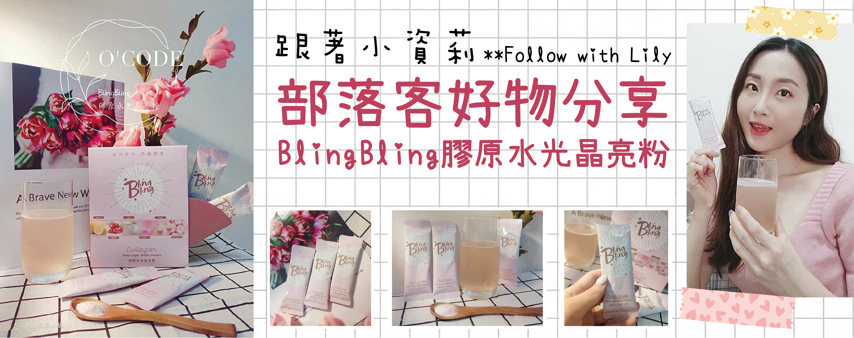 膠原蛋白粉(含德國魚膠原蛋白、義大利魚膠原蛋白)、綜合莓果粉(砂糖、草莓濃縮汁、蔓越莓濃縮汁、藍莓濃縮汁、覆盆莓濃縮汁、麥芽糊精、香料、檸檬酸、檸檬酸鈉、婀娜多色素)、維生素C、穀胱甘肽98%(圓酵母來源)、珍珠粉、綜合莓果萃取物(巴西莓、西印度櫻桃、黑莓、藍莓、蔓越莓、枸杞、葡萄籽、山竹、馬奇果、石榴、覆盆子莓、草莓)、以色列白番茄(冰晶番茄)、蔗糖素(甜味劑)、二氧化矽